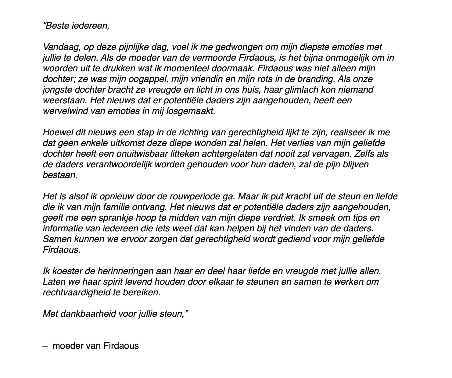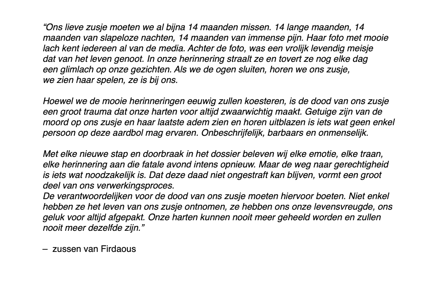 De moeder van het 11-jarige slachtoffer heeft een open brief geschreven die u hier kunt lezen. Ook de zussen van Firdaous hebben hun gedachten op papier gezet; die vindt u hier. Hopelijk komt er snel meer duidelijkheid over wie verantwoordelijk zijn voor het immense verlies dat de familie moet dragen.