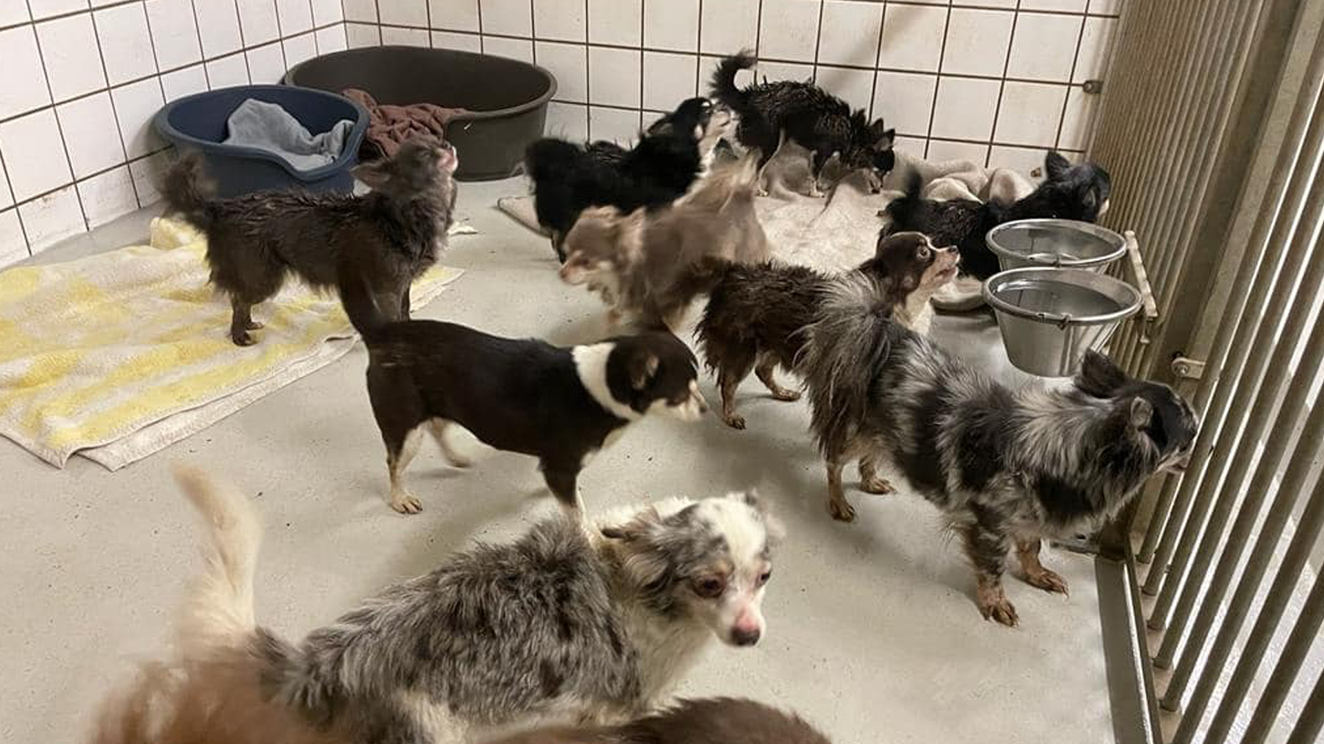 Zeventien van de hondjes zijn teefjes die in het verleden een nestje hebben gehad. Eén van de teefjes – op de foto hieronder – heeft vermoedelijk pas zes tot acht weken geleden een nestje gehad. Heeft u onlangs een puppy gekocht en herkent u deze moederhond? Neem alstublieft contact op.