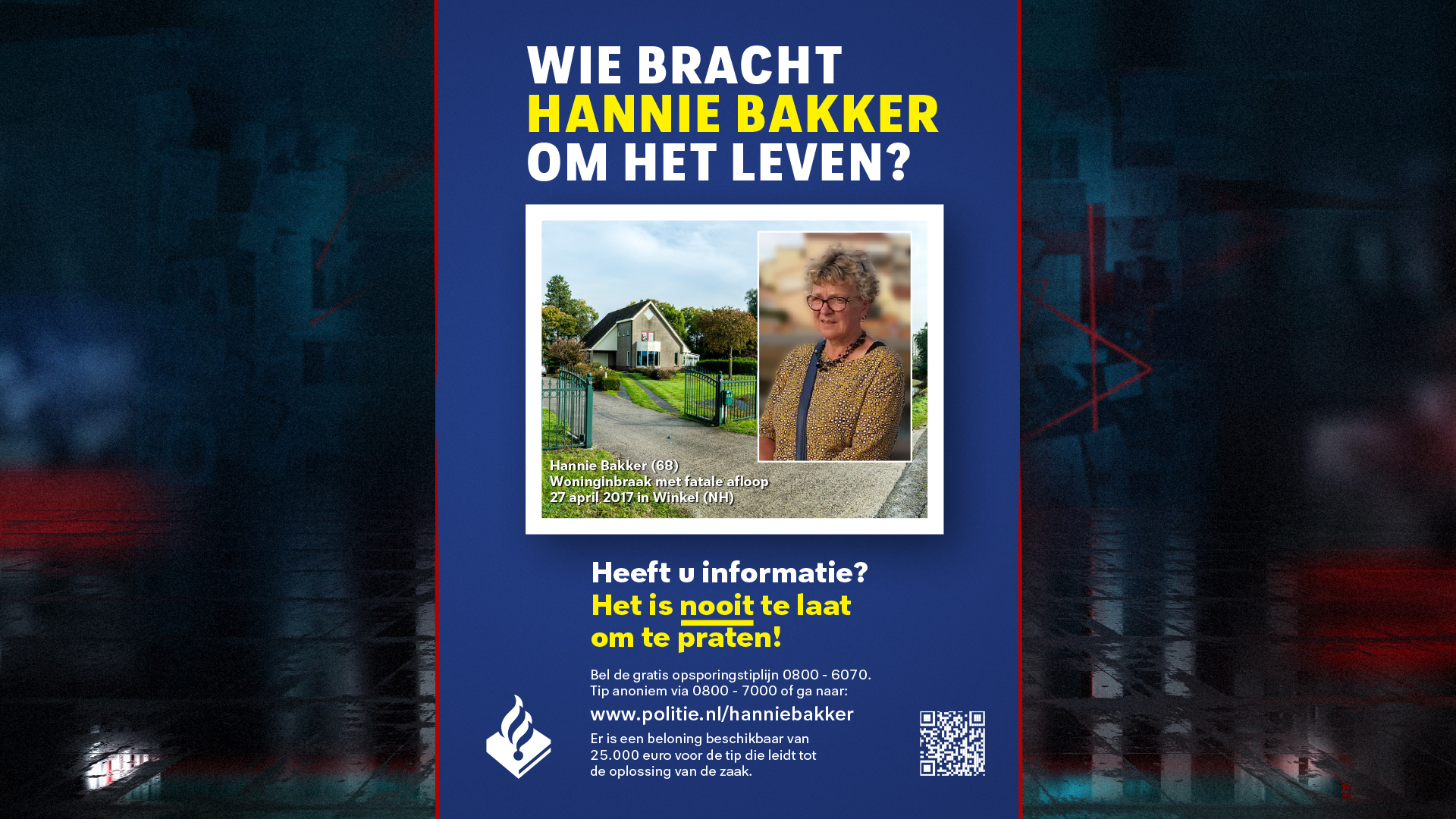 De politie zet alles op alles om de verantwoordelijke(n) te vinden voor de dood van Hannie Bakker in de Noord-Hollandse plaats Winkel. De 68-jarige vrouw werd slachtoffer van geweld in haar woning aan de Limmerschouw, zeer waarschijnlijk nadat ze ten minste één inbreker betrapte in de nacht van 26 op 27 april 2017.