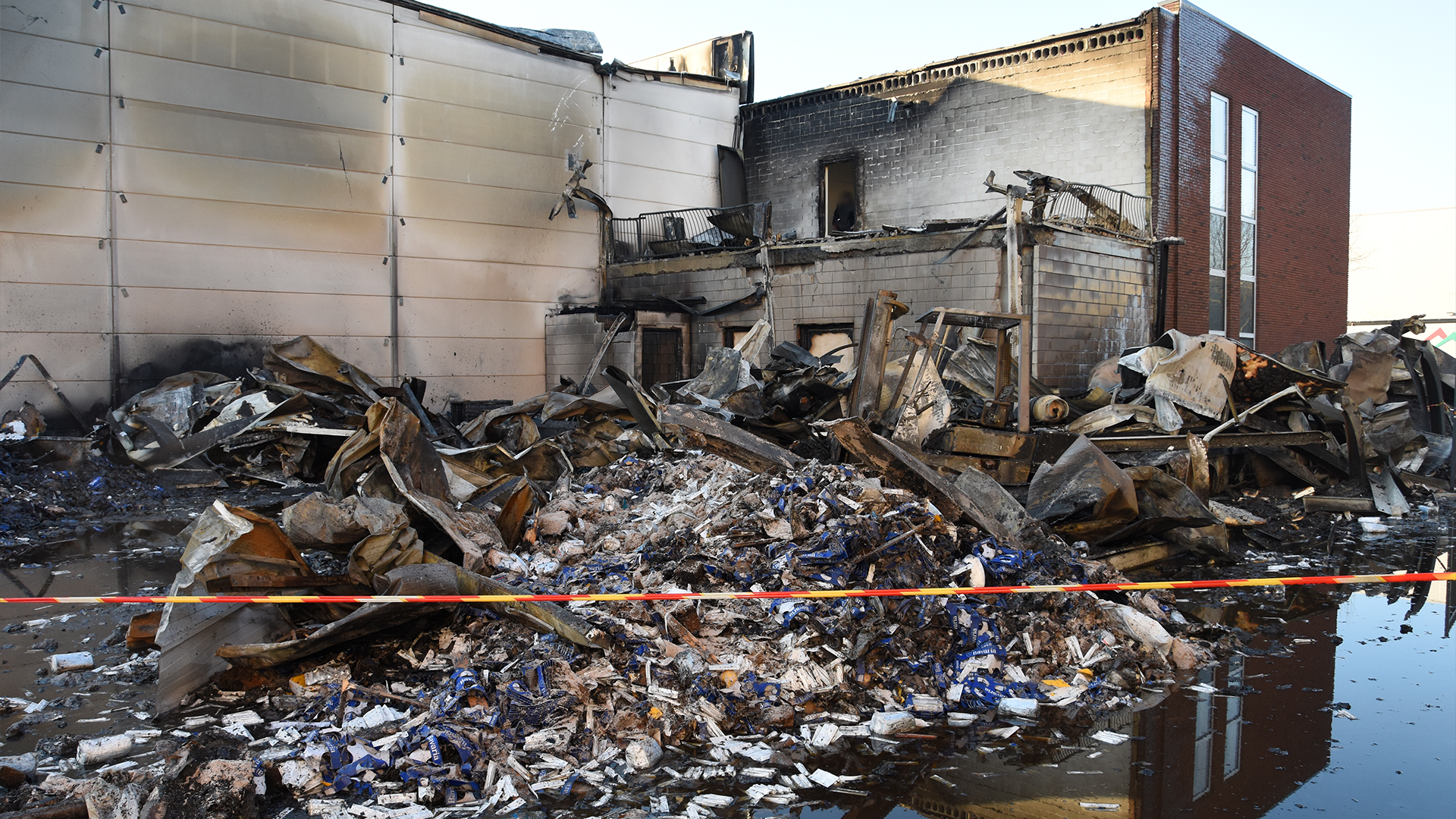 Na zo’n tien minuten volgde er een ontbranding, waarop het tweetal snel de benen nam. Na een explosie sloeg de brand meteen het gebouw in. De wandplaten van het gebouw werden door een tweede explosie weggeblazen.
