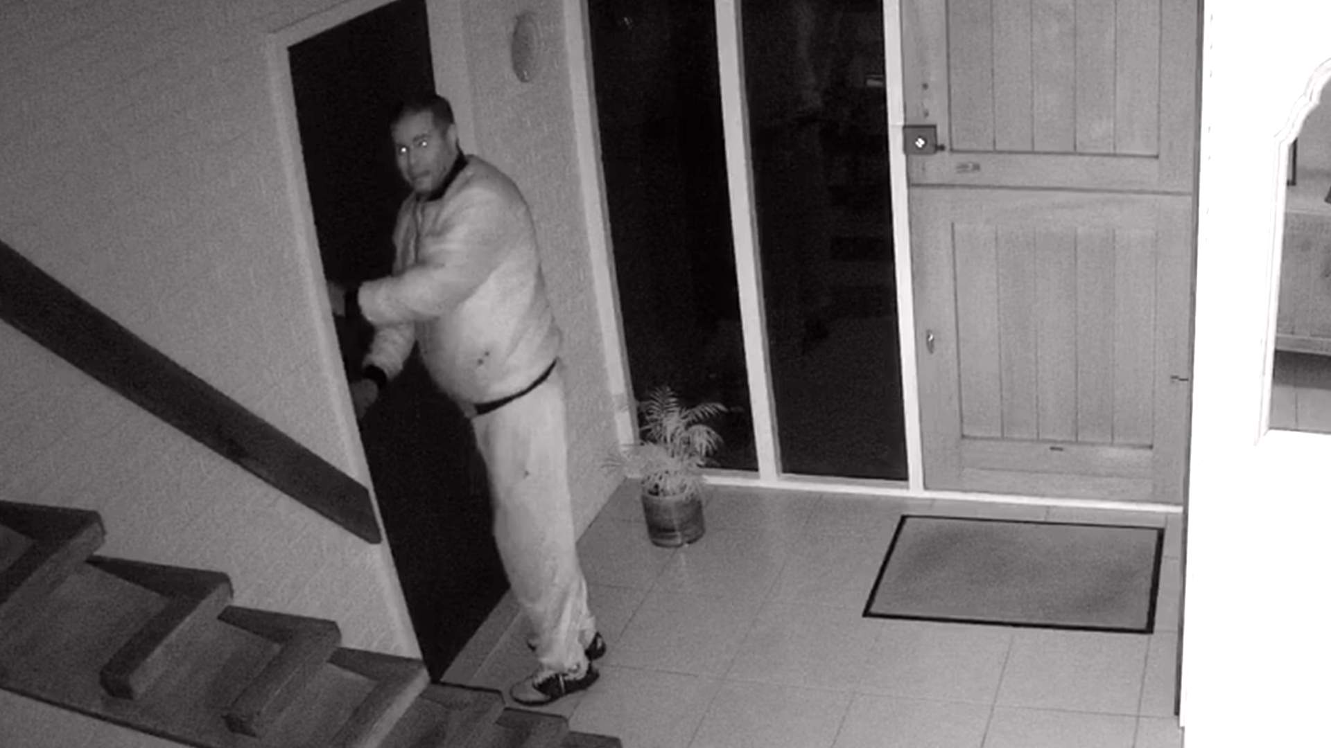 Te zien is hoe hij buiten de situatie verkent en vervolgens binnen rondsluipt. Hij gaat de trap op naar boven, maar vindt daar kennelijk niets van zijn gading, want is al vrij snel weer beneden.