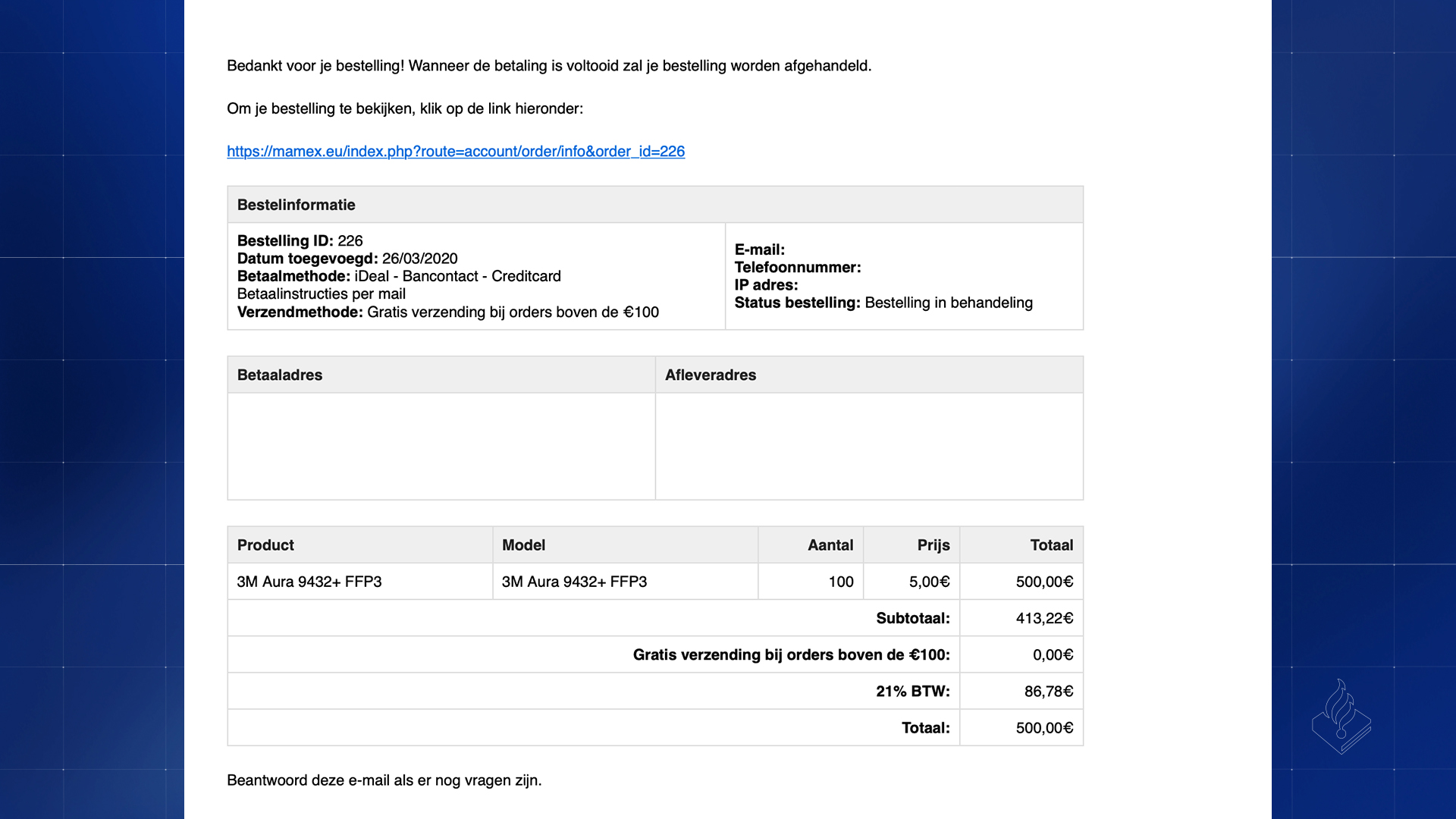 De politie zit bovenop deze criminaliteit en probeert ervoor te zorgen dat dergelijke sites zo snel mogelijk offline worden gehaald. Zo is onlangs de mamex.eu offline gehaald. Deze nep-webshop misbruikte de gegevens van het bedrijf Mamex BV en bood zogenaamd producten aan zoals mondmaskers.