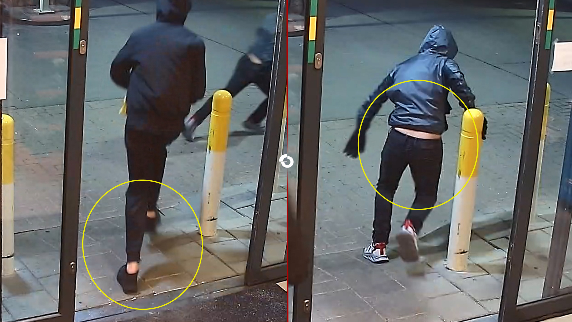 De dader met het wapen is de langste en dunste van de twee. Hij heeft een lichte huidskleur en was geheel in het zwart gekleed. De pet die hij onder zijn capuchon op had, heeft een witte opdruk. Deze man lijkt x-benen te hebben die ‘zwabberen’ als hij rent.