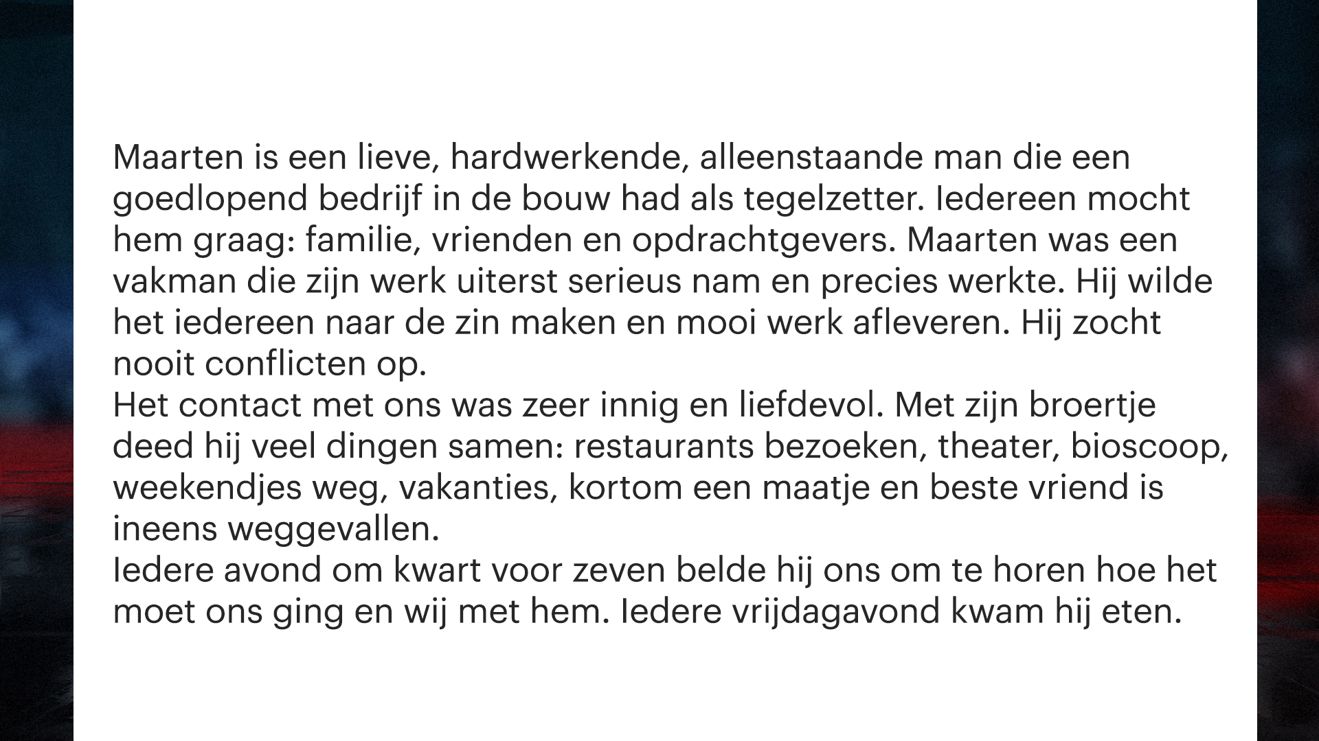 Maarten, een alleenstaande ondernemer met een bedrijf in tegelwerken, vertrok op dinsdag 23 januari in zijn bestelbus naar België, omdat hij een paar dagen vrij had. Hij had een hotelovernachting geboekt in Oostende en bezocht daar die dag twee keer het bekende Casino-Kursaal, waar hij wel vaker een gokje waagde. Tussen die twee bezoeken door is Maarten vroeg in de avond om onbekende redenen nog heen en weer naar Gouda gereden.