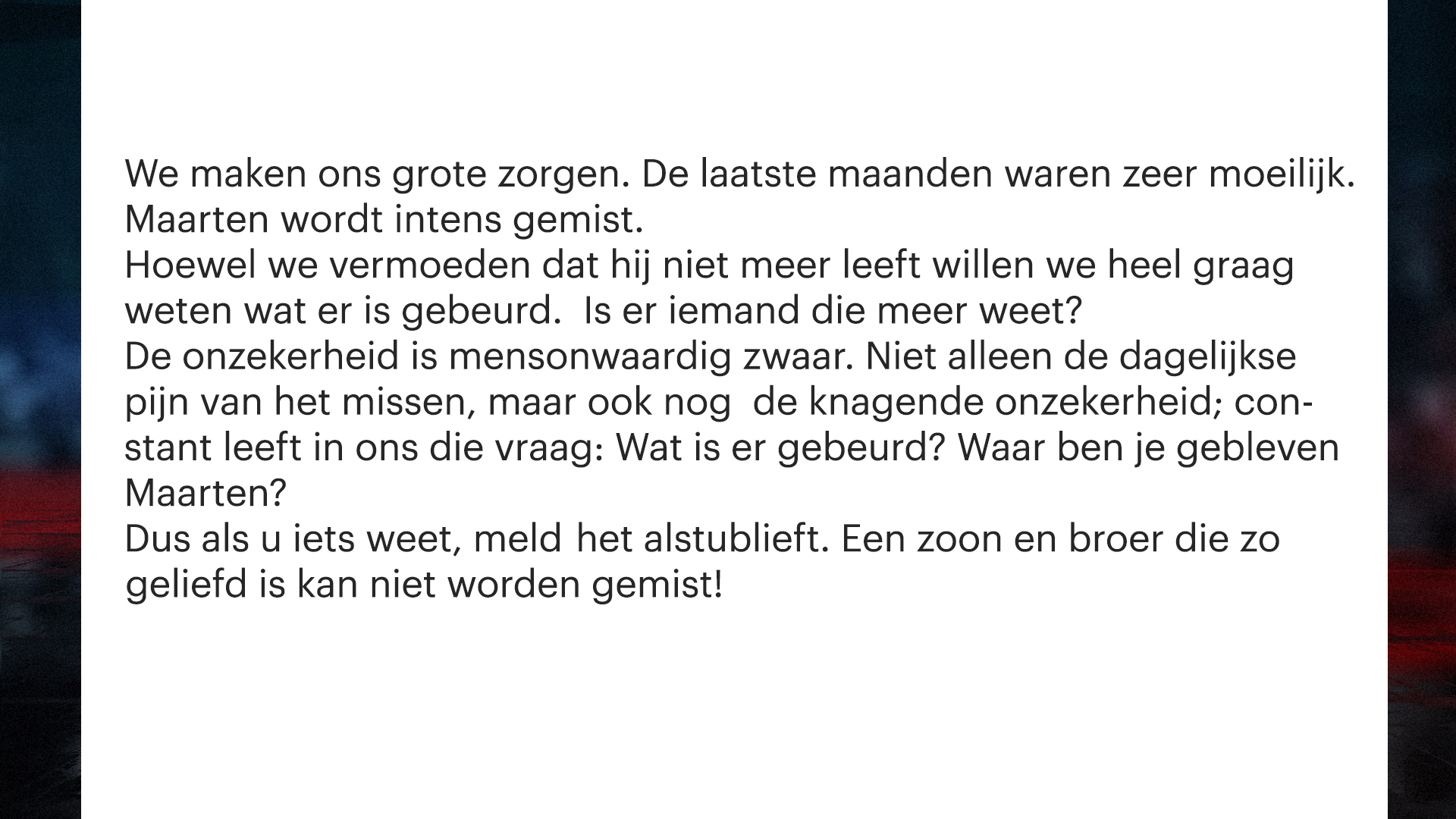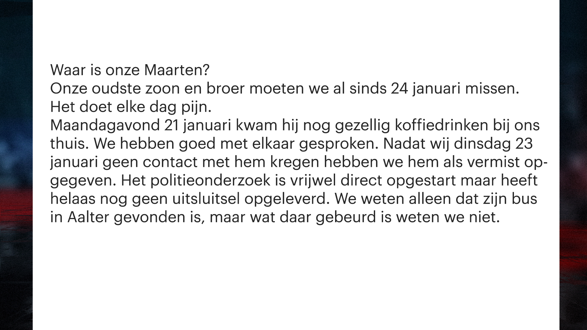 De VW Transporter werd in Aalter geparkeerd op het moment dat daar de wekelijkse markt werd opgebouwd. Mogelijk hebben marktlui die woensdagochtend gezien dat Maarten of iemand anders het donkergrijze voertuig neerzette. Ook informatie over een mogelijk conflict dat Maarten kan hebben gehad of over andere zaken die tot zijn verdwijning kunnen hebben geleid, is nog heel welkom.