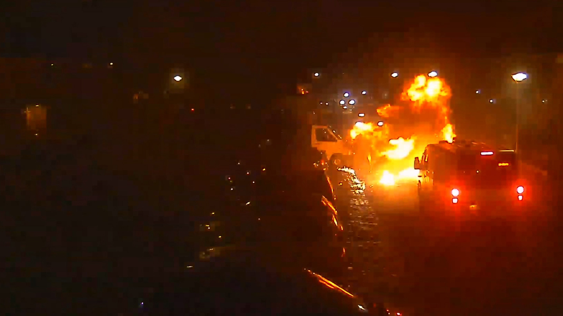 Een molotovcocktail belandde voor een ME-bus, waarna er een vuurzee ontstond. Ook hierbij raakte gelukkig niemand gewond.