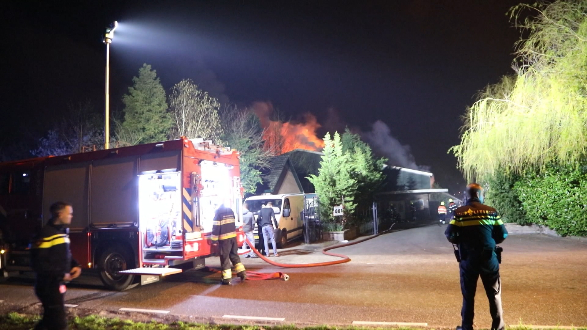 De politie denkt dat de mannen in een Opel Corsa reden uit een bouw-jaar tussen 2001 en 2006. Terwijl in de loods het vuur om zich heen greep, scheurde die auto iets verderop op de Spieringweg nog langs een beveiligingscamera. Daarna ontbreekt van de verdachten ieder spoor.