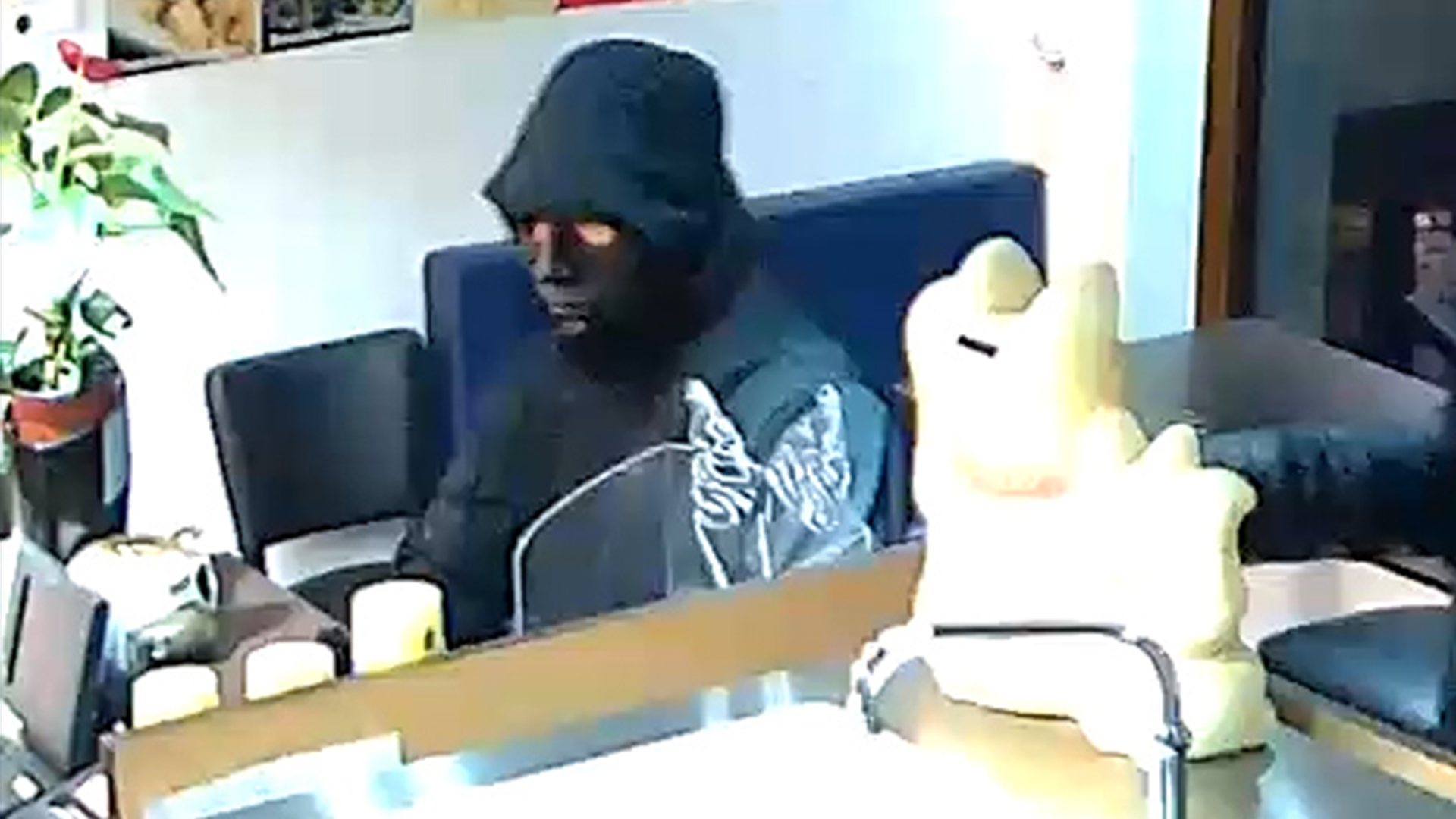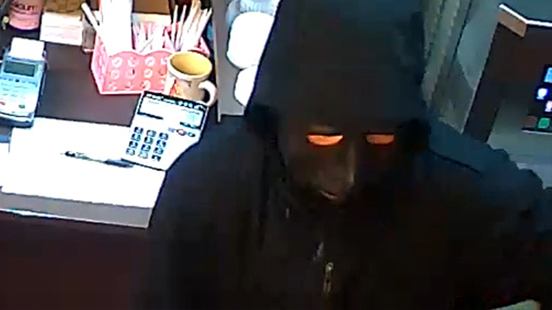 De nog gezochte overvaller heeft een lichte huidskleur en is zo’n 1.70 à 1.75 meter lang. Hij droeg donkere kleding, waarbij vooral het voorgevormde masker opviel dat hij droeg. Op zijn grijze handschoenen stond een logo.