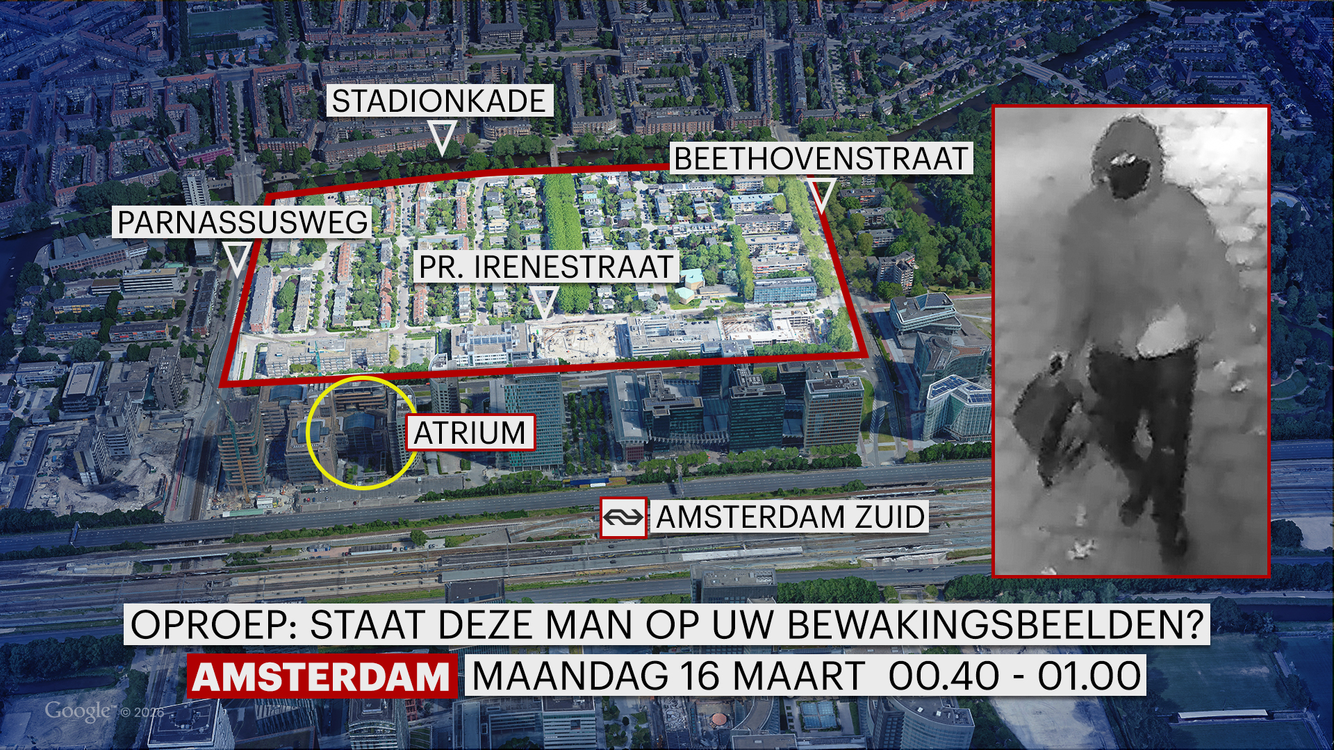 In onze uitzending van 16 maart vroegen we uw aandacht voor twee explosies in Amsterdam, waarvan één in de nacht ervoor. Die werd met opzet veroorzaakt bij het kantoorgebouw Atrium vlak bij station Amsterdam-Zuid. In het onderzoek naar dat incident kan de politie nu beeld van een verdachte laten zien.