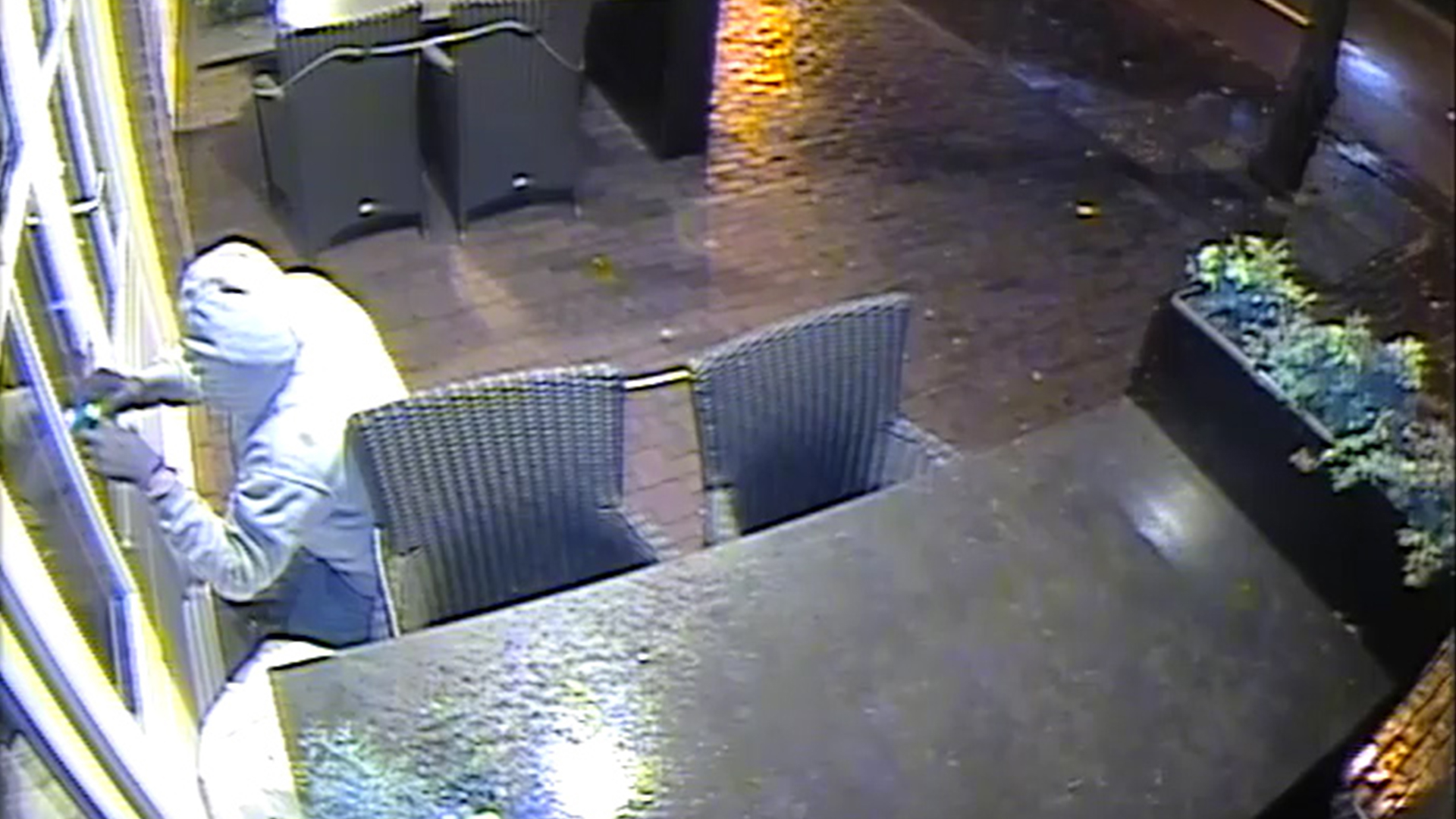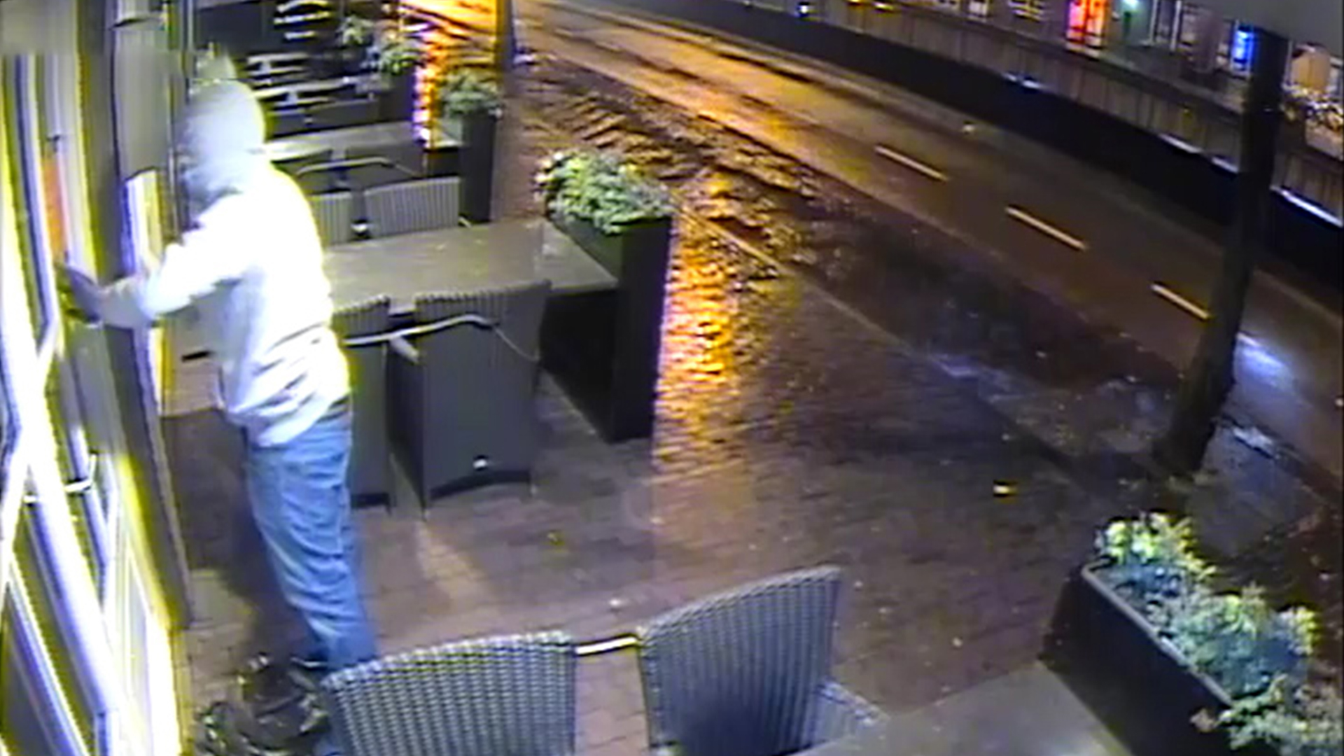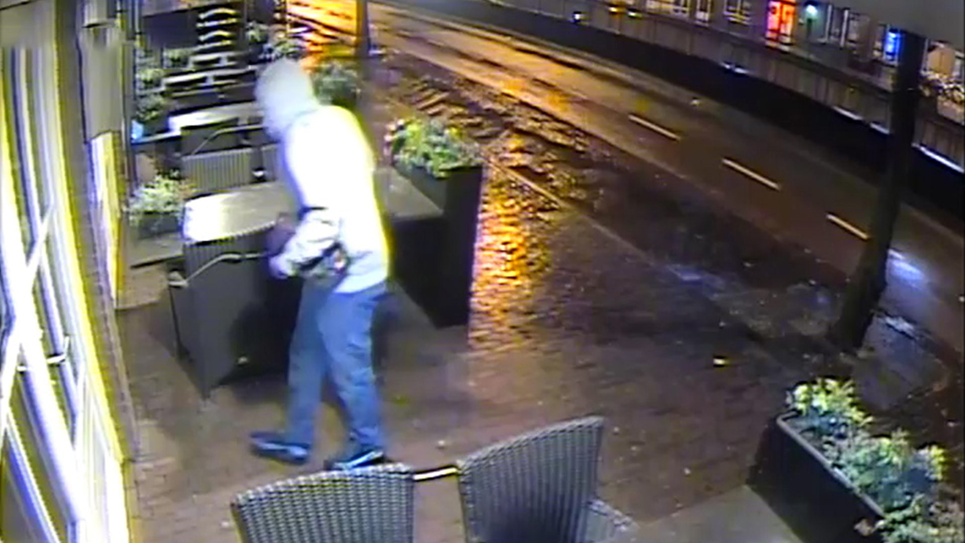 Bij het restaurant is de dader vrij duidelijk gefilmd. Hij had een bivakmuts op en droeg een lichtgrijze of witte hoody en een spijkerbroek. Te zien is hoe hij het zware, illegale vuurwerk tegen de ruit van de voordeur plakte. Zo’n twee minuten nadat de dader de lont aanstak en wegliep, volgde de explosie.